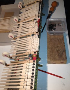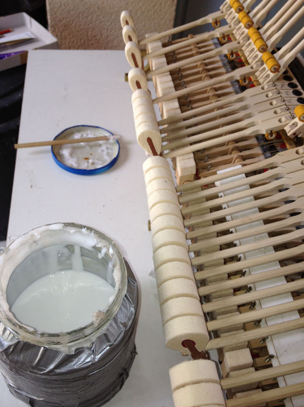 Once the shanks are in place, initial travelling precedes the glueing on of each hammer (having kept some guide hammers!):