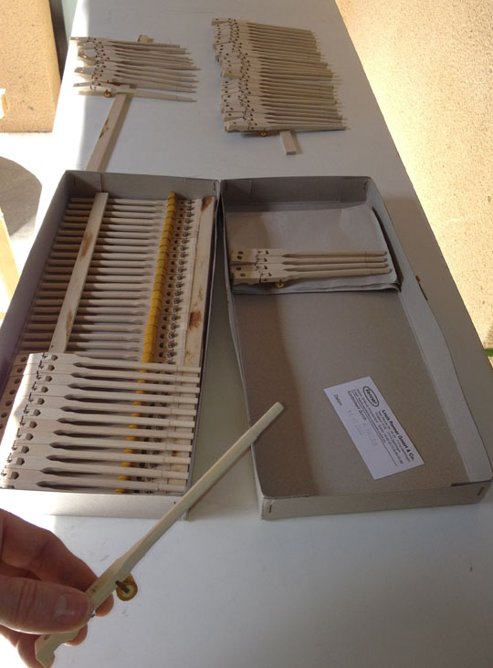 New shanks & hammers for a 1980 Steinway B model grand meant first sorting them via the tap test. This uses similar skills to selecting each plank of tone wood for the soundboard, by tapping each shank against a finger knuckle and thus grading the tone of each one from low to high in respect of its position in each section (bass, tenor, middle, treble, high treble, etc) of the piano.