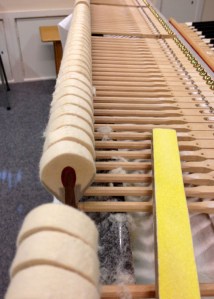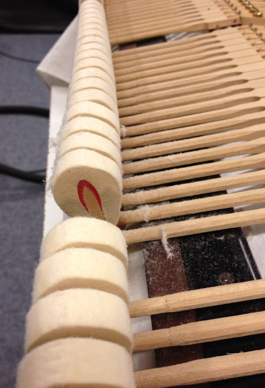 I think of this light re-facing as an institutional re-facing, because the need to preserve as much felt as possible means that the actual hammer nose is barely re-faced: this is only possible where hammer centres are stable and where the hammers have not been re-positioned.