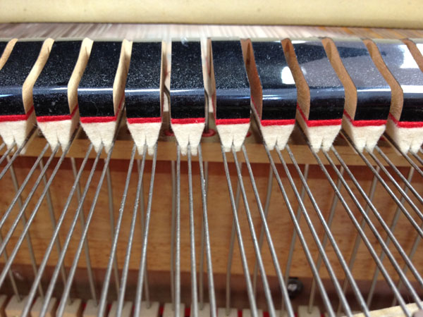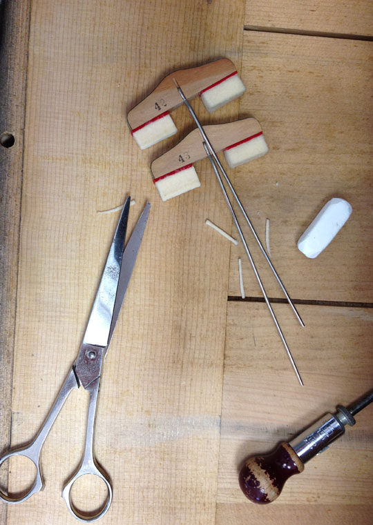 (So, as I was going to have to adjust them to pick up later, they were going to be lifted even less free of the strings, thus worsening the problem: there was no choice but to trim these felts).