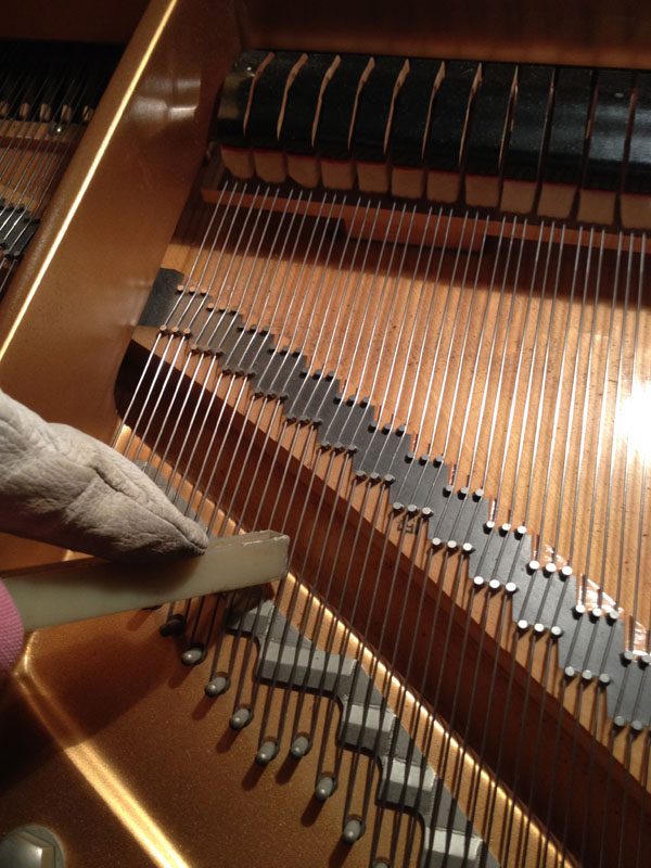 Do not tap strings too hard! For instance, a metal hammer/tuning hammer would have too much weight for this purpose, burrying the strings in the bridge (increasing drag/losing down-bearing/etc). Thus I use my voicing block, which is made of Beech with an inset piece of end-grain Bubinga as the mallet head!