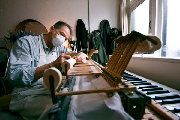 A common feature of hammers become too flat is a lack of dynamic range and control (especially in attempting a pp). Doing my usual Maintenance Reprofile of the hammers, along with appropriate hammer needling (voicing), of course, restored Pete’s enjoyment of his piano – and hopefully inspiration for more of his precise compositions: