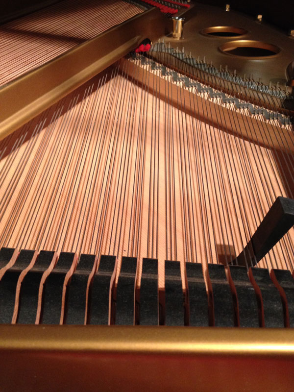 The Steinway Duplex scale, designed for its sympathetic resonance, can occasionally be too resonant – so that on this instrument (Steinway model O), I needed to weave in baize to the lowest of the (duplex) strings, because all the ‘C’ note dampers sounded like they weren’t working.
