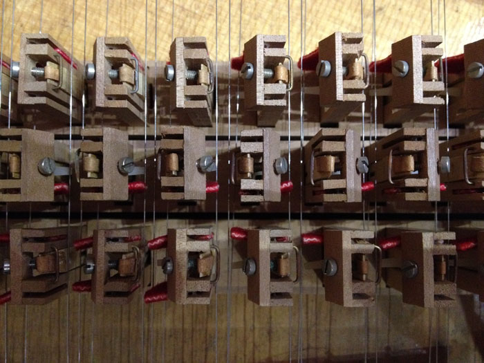 The aim is to adjust each dome screw so that minimum lifting is required to produce knocking, thus putting as little tension into the keyframe as possible. Adjusting each dome screw may affect its neighbouring screw, so check up and down the keyframe several times.